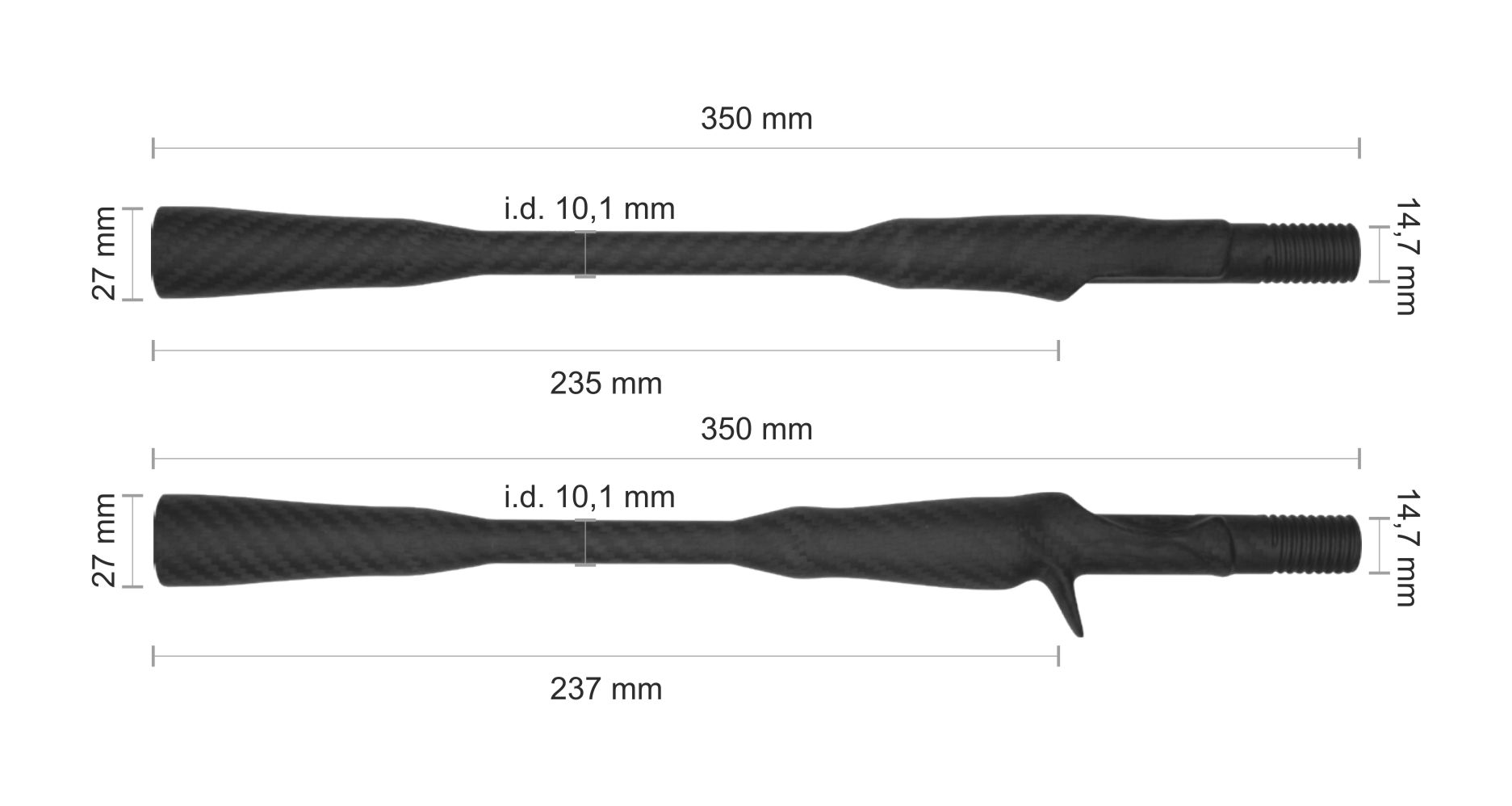 Manico in fibra di carbonio con portamulinello integrato. La struttura monoscocca garantisce massima robustezza e leggerezza, incrementando la sensibilità della canna grazie all’elevata rigidità del materiale. Disponibile nelle versioni spinning e casting, è compatibile con Fuji KDPS/ASH e può essere configurato con diverse soluzioni di montaggio.